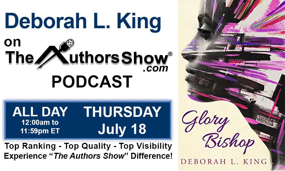 When I opened the email that contained an invitation to be interviewed on The Authors Show (after I submitted an application), I had a flash of memory. Back in 2019, after the release of my first novel, Glory Bishop, I was interviewed by the host, Don McCauley. I went digging through old emails and docs and found the old set of pre-supplied questions. For that interview, done via Skype, I’d sat at my dining room table and tried desperately not to sound like I was reading from a script. I kinda failed. Here’s the ad from the 2019 interview – notice the throwback cover of Glory Bishop.